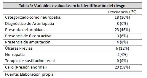 Los programas estructurados de cribado, el tratamiento del pie de riesgo y el control de los factores de riesgo son las medidas más efectivas para prevenir las úlceras del pie en personas diabéticas (10). Bus S.A. et al. recomiendan identificar el riesgo de ulceración del pie de personas con diabetes, realizando exámenes anualmente para buscar signos o síntomas de neuropatía periférica y enfermedad arterial periférica (11). Otros autores exponen que el primer paso para lograr el objetivo de la prevención de úlceras de pie diabético debe ser la detección y la medición del riesgo del pie mediante estratificación, dado que permite una asignación más efectiva de los recursos disponibles para prevención y tratamiento de esta complicación (12).